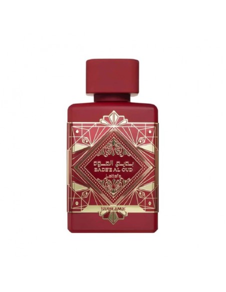 El envase de Bade'e Al Oud Sublime es una experiencia en sí misma. La botella, de peso considerable y con detalles dorados, destaca elegantemente sobre un fondo carmesí. La caja, adornada con chispas doradas y una tarjeta con las notas de fragancia, refleja la atención al detalle y el lujo característico de Lattafa Perfumes.